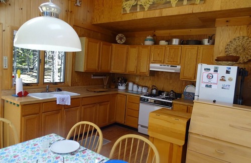 Le chalet a un salon / salle à manger / cuisine à aire ouverte avec poêle à bois (le bois est fourni). Les plafonds cathédrale remplissent l'espace de lumière naturelle. Il dispose de 2 chambres: Master avec lit Queen et une deuxième chambre avec deux lits jumeaux. Toute la literie est fournie. Il y a une salle de bain avec WC, lavabo et douche. Des serviettes de bain, du papier toilette ainsi que du savon et du shampoing seront fournis. La cuisine a une cuisinière et un réfrigérateur pleine grandeur (tous deux alimentés au propane). Tous les plats, casseroles et poêles ainsi que les serviettes en papier, le sucre et les épices de base sont fournis. Il y a une grande enveloppe autour du pont avec auvent et des sièges pour les repas en plein air. Grill extérieur et cuiseur à homard avec propane également fournis.