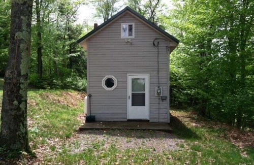 Une chambre - lit Queen. Tout l'intérieur en pin noueux, salle de bain complète, salon, manger dans la cuisine, foyer, charbon de bois, table de pique-nique, terrasse. Venez vous éloigner de tout. Télévision avec lecteur DVD et futon / lit dans le salon. Apportez votre motoneige ou vos skis en hiver. Nous sommes situés directement sur un sentier de motoneige et avons un stationnement supplémentaire pour les remorques. La cabine est attachée à 250 000 acres de terres forestières d'État.