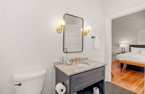 1876 at The McKey includes a bedroom, seating area, and a bathroom. Located on the fourth floor and named to honor the year that the first agricultural pecan tree was planted in Lowndes County, Georgia. Access to coffee maker and microwave. Above Gud Coffee company and within walking distance of many great restaurants and things to do in Downtown Valdosta. 1876 has a spacious standard bathtub and shower with great high end amenities.