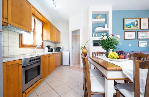 Un salon spacieux plan ouvert avec deux canapés crétois, une table à manger et une cuisine entièrement équipée, ainsi qu'une salle de bains avec douche et une machine à laver sont offerts au rez-de-chaussée. Un escalier en colimaçon mène au premier étage, où 2 chambres et une autre salle de bains commune avec baignoire sont fournis. La chambre principale dispose d'un lit double et TV, et la deuxième chambre offre deux lits simples.