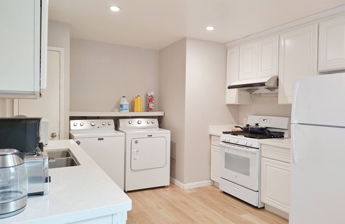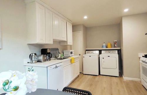 This is a 2-bedroom 1-bath apartment unit, with a full kitchen and private laundry. It is on the ground floor with no units above, a big courtyard, and two dedicated parking space near the door. It has a Queen bed and two Twin beds and can fit up to 4 guests comfortably.