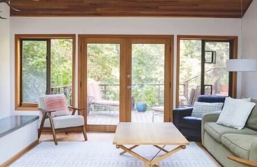 The kitchen is new and features top of the line appliances, concrete countertops and cabinets by Henrybuilt. The living room features a raised hearth fireplace and new furniture. Both the living room and kitchen have walls of glass that look out on the deck and the woods beyond. We have a full glass tiled slate bathroom and a large soaking tub, which offers a beautiful view of the woods. The shower is also glass, offering a "bathing outdoors" experience.