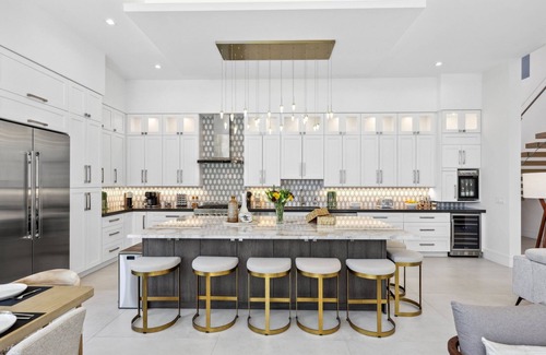 - Jenn-Air Noir appliances, quartz countertops, Italian marble backsplash