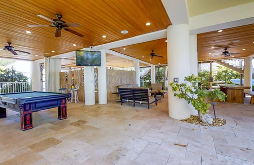 If you are looking for the ultimate Keys vacation, your search is over!! This private 4 bedroom 3.5 bath luxury estate home boasts a custom heated pool with spa, fire feature, huge outdoor living area with TV, pool table, beautiful wood table with seating for 8-10, covered garage and entryway, excellent boating with immediate access to the Atlantic and the Gulf, paddle boards and kayaks available for exploring the bay area. The breathtaking interior features an open living area with hotel quality elevator which services all 3 floors perfect for groceries and/or persons that have trouble with stairs, Sonos surround sound system through out the entire house and outdoor area, gorgeous fully equipped kitchen, top of the line appliances, eat in bar, and dining area. The main floor consists of 3 bedrooms (2 queen beds and 2 full size beds) and 2.5 baths. The master features a kings size bed with a stunning master bath with custom glass and marble walk in shower and walk in closet. Enjoy the southern breezes from the private balcony off of the master bedroom with endless views of the Atlantic.This home is by far one of the nicest homes in the Florida Keys!! Come experience it for yourself!!