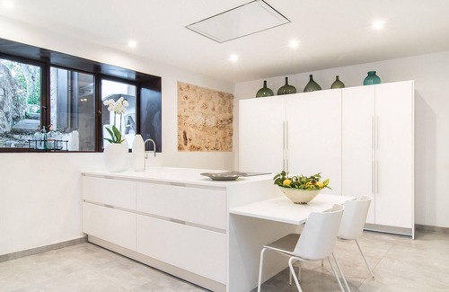 The interior design of the house is cool and absolutely trendy, providing a very comfortable and spacious temporary home for up to ten guests. Large floor tiles, gleaming white walls with natural stone elements and original lighting create a very aesthetic atmosphere. Relax on the large sofa in the relaxation area or enjoy a delicious meal in the dining room. This is open to the modern, fully equipped kitchen with cooking island. On the same floor there is also a large bathroom with shower and a laundry room with washing machine and tumble dryer. A second beautiful living room with large windows is located on the upper floor. There are also four double bedrooms and two bathrooms with shower. The fifth double bedroom and a shower room are located in the basement.
