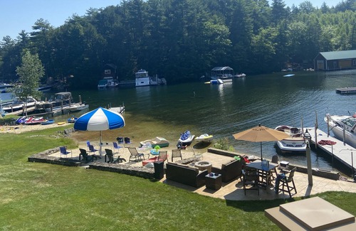 This home is perfectly located in a quiet cove on Lake Winnipesaukee. Open concept lakefront home with 5 spacious bedrooms, 3 updated bathrooms, two family rooms, loft and beautiful gourmet kitchen that features double ovens, 48" Sub-zero fridge/freezer, and six burner Thermador cook top. Outside there is a large wrap around deck with magnificent views of the lake and mountains. There are two large family rooms that overlook the lake, well manicured yard, and PRIVATE sandy/shallow beach with a resort style 12' built in umbrella. There is also a stunning lakeside patio that features a remote controlled gas firepit, two outdoor couches, and a high top patio set. Bring your boat or rent one as this home features a 40' foot deep water dock with space for one large boat. There is also a private jetski ramp (jetski not included), paddle boat, and Kayak available for use. Other features include a heated outdoor shower (not enclosed). Multiple outdoor dining options, two tables on the main deck, one table on the small patio, and a fourth table on the main patio. Indoor and outdoor stairwells all equipped with custom built gates for child safety. 2 Pack-N-plays available for small children. One indoor/outdoor high chair. Access to washer/dryer. Central Air in main house. Some bedrooms with wall units. No pets allowed. No smoking allowed on property (inside or outside).