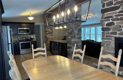 Tout récemment rénové cuisine complète, salle à manger, salon en 2012. Armoires en cerisier foncé avec comptoir en quartz, nouveaux appareils en acier inoxydable, y compris un plateau de boissons sous le comptoir dans le grand îlot. La grande île de quartz inscrit dans les magnifiques piliers en pierre de l'artisanat à la main qui sont dans le centre de la pièce. La cuisine peut accueillir confortablement 12. Le concept ouvert et le plafond voûté se combinent au grand salon de 20 mètres de long avec des vues sous tous les angles grâce aux 2 portes coulissantes en verre, au grand pont personnalisé et aux rangées spectaculaires de nouvelles fenêtres à garnitures blanches. Les fenêtres enrouler autour de l'ensemble du grand espace pour permettre à la brise fraîche, une vue imprenable et les sons des huards.