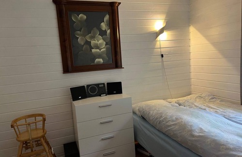 Layout: open kitchen(cooker(electric), hood, coffee machine(filter), microwave, dishwasher, fridge, freezer(200-249L), tumble dryer, washing machine), Living/bed room(25 m2)(TV(german television channels, norvegian TV channels ), chromecast), bedroom(double bed, children's bed), bedroom(double bed), bedroom(2x single bed), bedroom(single bed), bedroom(single bed), bathroom(floor heating)(bathtub or shower, washbasin, shower, shower, toilet), heating(electric), terrace, garden furniture, BBQ, parking, air to air heatpump