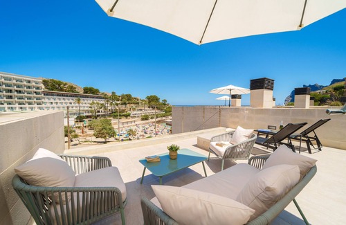Cet appartement jouit d'une excellente situation avec vue sur la mer et les montagnes de la Serra de Tramuntanta, que l'on peut apprécier depuis la magnifique terrasse avec vue sur la mer et le toit-terrasse avec chaises longues et barbecue.