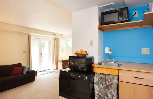 L'entrée du patio au rez-de-chaussée orientée au sud est entourée de fleurs (en saison) et d'arbres matures. À l'intérieur, il y a un salon avec un grand canapé, un coin bureau et coin lecture, une kitchenette, un coin repas, une salle de bain très propre et une chambre avec un nouveau lit queen.