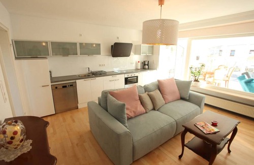 Le salon lumineux avec télévision à écran LCD 40 pouces, kitchenette intégrée et Bigsofa brille de confort.