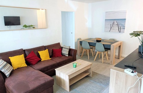 Appartement entièrement refait à neuf, situé au rez de chaussée d'une résidence de standing. D'une superficie de 45m², il est composé d'une chambre double avec télévision, d'un grand salon, salle à manger avec un canapé-lit et télévision à écran plat, d'une salle de bains avec douche à l'italienne et WC, et d'une cuisine entièrement équipée avec plaques gaz, four électrique et lave vaisselle.