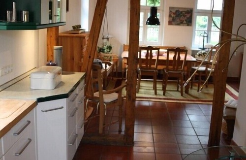 Une maison complète pour vous, votre famille et vos amis. En passant devant le jardin d'herbes d'agriculteurs conçu avec amour, vous entrez dans la maison par la vieille porte d'entrée. Le sol en terre cuite du rez-de-chaussée s'intègre parfaitement avec les colombages apparents. 2 chambres au premier étage et un studio avec mezzanine et cheminée supplémentaires offrent un espace confortable pour 7 à 9 personnes maximum. Les chambres sont équipées de TV (système satellite). Le salon-salle à manger avec poêle en faïence et cuisine attenante (avec équipement complet, qui ravit également le cuisinier amateur) vous invite à une réunion chaleureuse avec la grande table en bois. 2 salles de bains modernes (bien sûr avec une fenêtre) sont disponibles: une salle de douche et une salle de bain avec baignoire et douche. Avec le WiFi gratuit (50 MBit), vous pouvez rester connecté (si vous le souhaitez) au monde malgré l'idylle rurale.