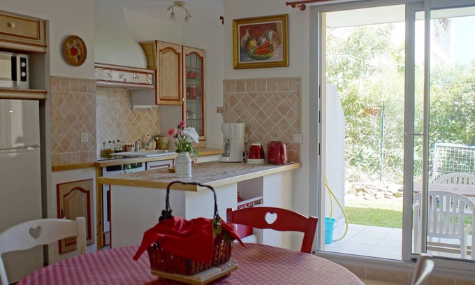 L'appartement de plain-pied comprend 2 pièces, un vaste séjour avec cuisine américaine entièrement équipée ( sauf lave-vaisselle) et un canapé + 1 chambre avec lit en 160 de large , 2 tables de nuit et une grande armoire .