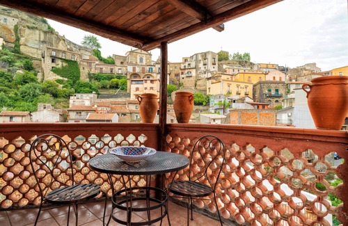 Votre espace extérieur privé comprend une terrasse couverte et deux balcons. La chambre quadruple au rez-de-chaussée dispose d'un balcon tandis que la chambre triple à l'étage bénéficie d'une belle terrasse avec vue sur la ville et le magnifique château de Lauria.