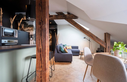 Situé sous les toits, au 4ème étage sans ascenseur, dans un petit immeuble paisible de 4 appartements, notre logement très bien isolé et climatisé comprend une pièce de vie ouverte sur une cuisine américaine, une buanderie (avec lave-linge séchant) et une chambre séparée. Profitez d’un appartement très bien équipé (climatisation, wifi, lave-linge séchant, lave-vaisselle, cafetière Nespresso, frigo, four, micro-ondes, sèche-cheveux etc.) qui vous permettra de voyager léger et séjourner l’esprit tranquille dans un cocon bien pensé. Le salon est équipé d’une TV connectée et un canapé convertible pouvant accueillir deux voyageurs supplémentaires. Le wi-fi vous permet de travailler sereinement. La cuisine est équipée de deux plaques, un four, un frigo, un freezer, un four à micro-ondes, un lave-vaisselle, un grille-pain et une machine Nespresso. La chambre comprend un grand lit double et des placards. Vous aurez accès à l’intégralité de l’appartement et pourrez arriver en toute autonomie, à l'heure de votre choix grâce à l'utilisation d'une boîte à clés. Vous pouvez stationner gratuitement au pied de l'immeuble sur la voirie ou bien sur la place attenante qui compte une 12aine de places ainsi que dans les rues alentour. Il est généralement facile de trouver une place pour se garer. Une borne de recharge électrique se trouve également à 50m de l'immeuble.
