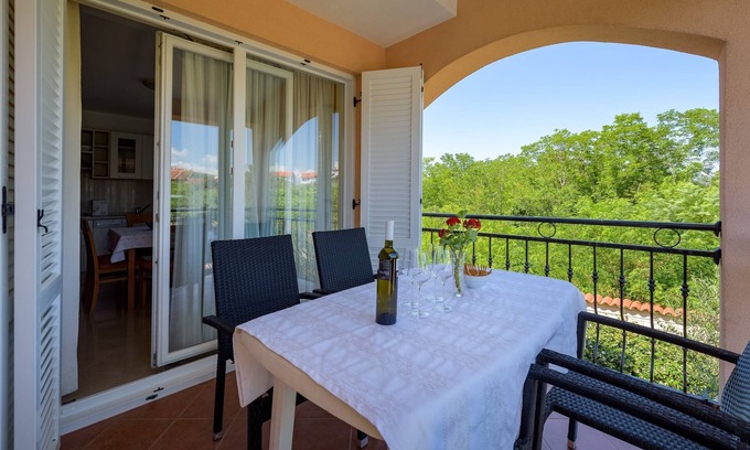 Apartment can accommodate 6 guests. Beds are situated in 2 sleeping rooms, but also in the living room, within 60m2. Guests can use a private terrace to enjoy the warm summer evenings. Food can be prepared using barbecue which is shared with other guests too. Shared pool is on disposal during stay.