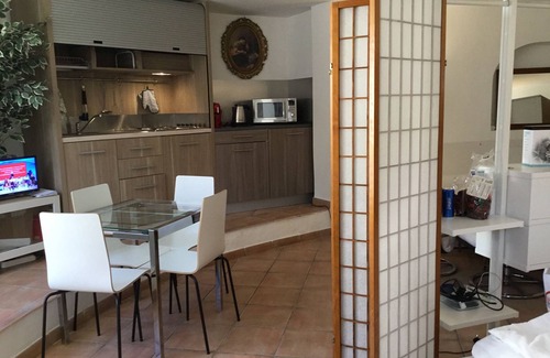 Tout l'appartement IFO Rome adjacent est situé au rez-de-chaussée, 54 mètres carrés, il comprend un salon avec kitchenette, une salle de bain avec douche, un coin repas et un coin chambre.