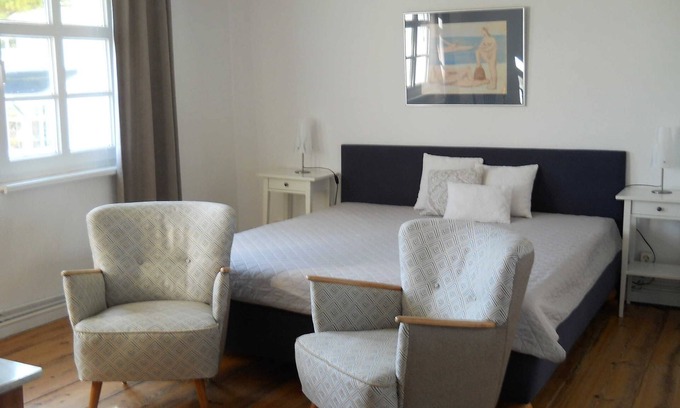 L'appartement Marta avec ses 38 m² provient de l'escalier central commun. La largeur ouverte de la salle fait le charme de la maison, elle semble invitante et gaie. L'appartement dispose d'un grand salon lumineux avec vue sur la mer de 17 m² avec un lit double (180 cm), d'un confortable coin salon avec télévision par satellite et d'une vue sur les vieilles maisons de ville - d'une cuisine adjacente, entièrement équipée (cuisinière avec 3 plaques vitrocéramiques, réfrigérateur, congélateur, Cafetière, grille-pain, mini-four, bouilloire) surplombant les jardins d'Alt-Sassnitz - un cadre ouvert au charme spécial qui associe une zone de repos douillette avec un canapé-lit, adjacent à une cloison, une grande douche et un lavabo - des toilettes séparées - les vieux planchers en bois, avec les portes à cassette d'origine, constituent un élément essentiel du style de cet appartement pour 2 personnes - Wi-Fi.