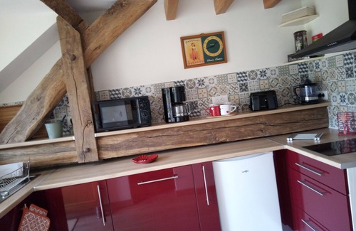 Cuisine équipée : four micro-ondes grill, cafetière, grille-pain, plaque induction 2 feux