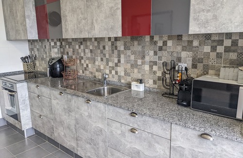 Dans une cuisine, vous avez la base pour préparer vos repas et une machine à café Nespresso.