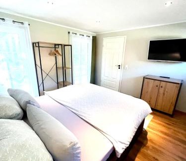 Salle de bainsServiettes, Papier toilette, Sèche-cheveux, Salle de bains privative, Savon, Douche, ToilettesHigh-techTélévision, Télévision à écran platCuisineBouilloire électrique, Produits ménagers, Verres à vin, Grille-pain, Table à manger, Plaque de cuisson, Cuisine, Réfrigérateur, Ustensiles de cuisine, Micro-ondes, KitchenetteEn extérieurBalcon, Espace repas extérieur, Terrasse, Mobilier d’extérieurCoin salonCoin salon, Coin repasGénéralExtincteur, Entrée privée, Clé d'accès, Détecteur de fumée, Chauffage, PoubellesVueVue sur le jardinChambreLinge de maisonÉquipements en chambrePortant, Oreiller sans plumes |