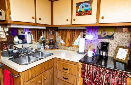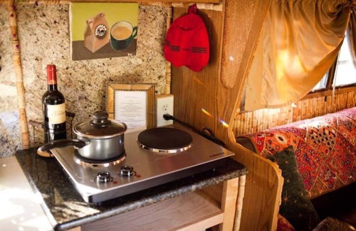 Bohemian glamping in Bastrop County with an 8' Cowboy soaking tub, cool or hot. Plant Lovers Paradise with natural wooded surroundings, a greenhouse to explore and several gardens. The ArtV is fenced in for extra privacy with a fire ring, hammock, cafe table & chairs, Weber grill in the cozy, shady yard. Comp charcuterie board provided for you.