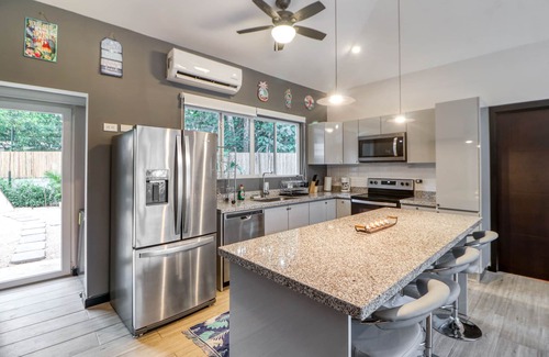 Located in the heart of Avellanas Beach and a half-mile from the shoreline, this dog-friendly villa at The Point is your ticket to beachside paradise. Inspired by nature, the interior design is light and bright with vibrant tropical color pops and floor-to-ceiling windows that add abundant natural light. A three-seat center island anchors the well-equipped kitchen, complete with stainless steel appliances. Gather in the open living and dining area, beautifully appointed with a stylish sofa set, TV, and six-seat wood table. Stay cool at night with the partial AC in both bedrooms, and sip morning coffee on the furnished patio overlooking the lush landscape.