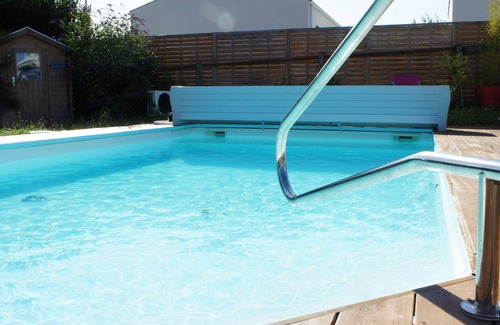 - Une piscine chauffée privée 4x8m , avec volet roulant électrique pour la sécurité enfants, entourée d'une terrasse en bois exotique.