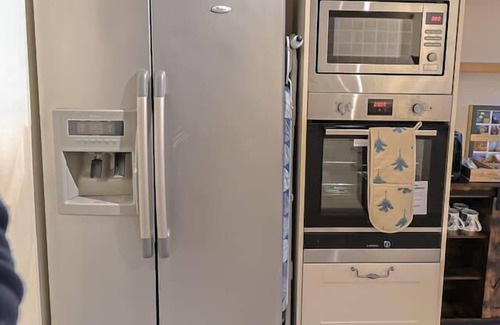 The kitchen has a fridge, a hob, an oven, a kettle, a freezer and a microwave.