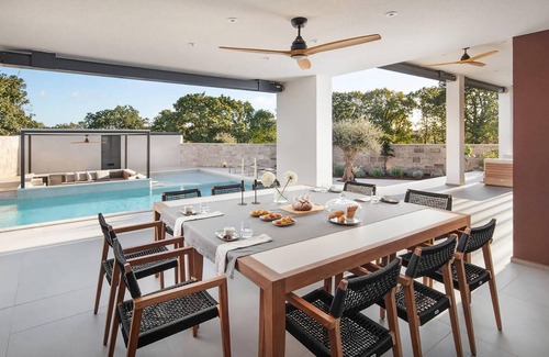 Non loin du fjord Limski et de la magnifique côte adriatique, cette grande maison à l'architecture moderne vous accueille. Les pièces grandioses et confortables de la villa sont réparties sur un seul niveau et vous invitent à vous détendre sur le canapé. Associé à la salle à manger et à la cuisine élégante et entièrement équipée, cet espace constitue le cœur de la villa, où se réunir en groupe devient un plaisir.
