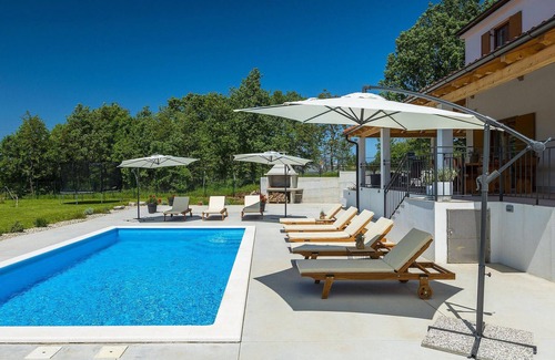 La villa Roza-Dolinci se trouve au cœur de l'Istrie, dans le paisible village de Dolinci, Sveti Petar u Sumi. Elle est construite dans le style traditionnel de l'Istrie et vous invite au calme et à la détente totale. Le rez-de-chaussée de la villa se compose d'un salon confortable, d'une salle à manger, d'une cuisine entièrement équipée avec un îlot de cuisson où chacun peut apprécier le charme de la cuisine, d'une chambre joliment meublée, d'une salle de bain et de toilettes séparées. À l'étage supérieur se trouvent les 3 autres chambres, dont deux chambres avec deux lits simples qui peuvent être reliés entre eux et une chambre avec un lit double. Toutes les chambres ont une salle de bain privée, une Smart TV et la climatisation. Le salon et les chambres sont décorés avec des peintures abstraites d'artistes locaux. La maison est conçue avec style dans l'esprit istrien, avec des matériaux naturels et de nombreuses parties en bois, comme une terrasse couverte où se trouve un coin repas en plein air et un barbecue au charbon de bois. Devant la villa se trouve une piscine de 32m2, un endroit idéal pour se rafraîchir pendant les chaudes journées d'été. Le rez-de-chaussée (salon, chambre et salle de bain), l'espace extérieur autour de la villa, la terrasse et le solarium à côté de la piscine sont adaptés aux personnes à mobilité réduite et aux personnes en fauteuil roulant. La piscine et la terrasse sont orientées vers le sud, ce qui permet de profiter du soleil toute la journée. À côté de la piscine se trouve un pool house avec un coin salon où vous pourrez vous détendre. La villa dispose d'un trampoline et de jeux de fléchettes pour des moments amusants pour toute la famille. Si vous souhaitez explorer les environs, la situation de la villa dans le centre de l'Istrie vous permet de rejoindre très rapidement les manifestations et événements variés et nombreux dans chaque partie de l'Istrie. Profitez de vacances ensemble dans la villa et créez des souvenirs inoubliables dont vous vous souviendrez longtemps!Sveti Petar u Sumi tire son nom d'un monastère bénédictin datant du début du 12e siècle, mais a appartenu pendant des siècles aux Pauliciens - les moines blancs. C'est un lieu istrien inhabituel. Contrairement à d'autres lieux et villes d'Istrie, où les villages sont situés sur une montagne, Sv. Petar u Sumi se trouve sur un plateau vallonné, entouré de vieilles forêts. Dans les environs, il existe une piste cyclable de 18 km qui mène les visiteurs à travers une nature intacte. Le sentier de randonnée Krini put, long de 4,2 km et comportant 14 stations avec des sculptures en pierre représentant des motifs sacrés, est également très attrayant. De nombreuses manifestations ont lieu à Sveti Petar u Sumi et attirent chaque année de nombreux visiteurs. La plus connue est la foire à la saucisse, où se déroule le championnat de farce traditionnelle à la saucisse. Non loin de la villa, vous trouverez de nombreuses tavernes où vous pourrez déguster les meilleurs mets d'Istrie. Nous vous recommandons de visiter d'autres destinations touristiques, comme les villes de Pula et Rovinj sur la côte et les villes médiévales de Motovun et Buzet en Istrie centrale.