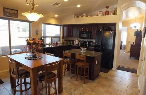 Notre maison de vacances est entièrement meublé avec de beaux meubles de haute qualité, TV, chaîne stéréo, éclairage extérieur, Patio Brumisation, draps, serviettes, entièrement Aménagée Cuisine, laveuse à chargement frontal / sécheuse et barbecue en plein air. La maison a un nouveau revêtement de sol tout au long ainsi que des lunettes de soleil pour toutes les fenêtres. Le Barbecue Grill est relié au gaz naturel de sorte que vous ne aurez jamais à vous soucier de réservoirs de propane vides. Le système de brumisation sur la terrasse couverte vous permettra de vous asseoir dehors et profiter de la piscine en même temps le plus chaud de l'Arizona.