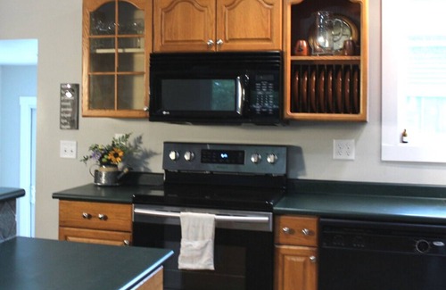 Troisième niveau - Cet étage de la maison ressemble à un sous-sol ensoleillé. Il a une salle de rumpus de bonne taille avec une cheminée à bois. En ce moment, la cheminée est juste pour l'apparence et nous ne pouvons pas y avoir de feu ... j'espère qu'un jour elle crépitera à nouveau, mais pour l'instant le rocher donne une belle sensation terreuse à la pièce. Il y a une chambre avec un lit queen, un placard et une commode pour vos objets personnels. La chambre reste agréable et fraîche en été.