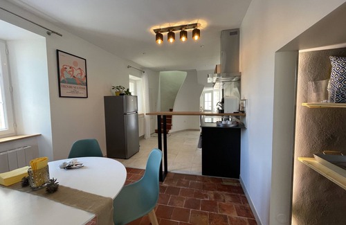 Au premier étage, une pièce (22m2) à vivre ouverte comprenant cuisine entièrement équipée et salle à manger lumineuse donnant sur le cœur du village.