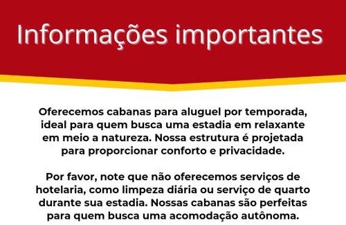 D'après les informations rapportées par le propriétaire ou gestionnaire, Cabanas Loft Paraíso indique 1 day politique de séjour dans cet cabine. Les invités sont prévenus que la politique de séjour minimum peut différer en fonction de la saisonnalité ou de disponibilité et peut être à la discrétion du propriétaire ou du gestionnaire.