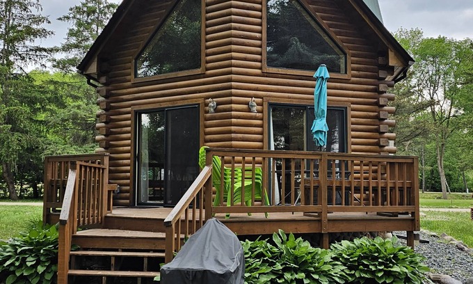 Cette première cabane en rondins de deux étages comprend toutes les commodités et peut accueillir jusqu'à 9 personnes, dispose d'une kitchenette, d'une salle de bain et demie et d'une terrasse arrière spacieuse donnant sur le front du canal Partridge Lake.