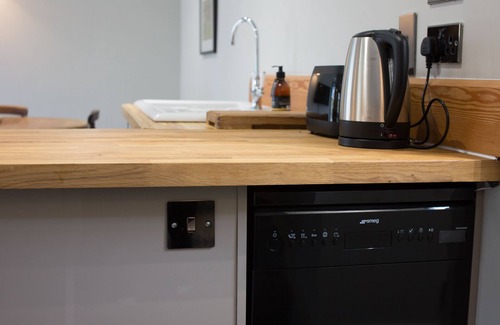 Cuisine - lave-vaisselle Smeg, plaque de cuisson AEG, four Bosch, plans de travail en chêne, réfrigérateur