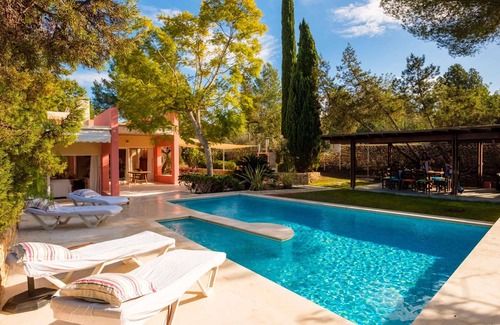 This Ibiza holiday let is a family summer home; when it was designed, the top priority was to allow the owners to enjoy living outdoors (bathrooms at the pool area, reading in the shade of the carob trees, dinners by moonlight, long lunches, fiery sunsets, walks along nearby trails, peace of mind while your children play safely in the garden, and so much more).