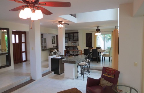 Profitez de tous les luxes de la maison. Tout au long de cette villa, vous trouverez de beaux planchers en calcaire poli et de beaux objets d'art. L'étage principal a cinq portes de patio qui permettent à la belle brise des Caraïbes de traverser la villa. Il y a aussi une zone creusée qui contient le salon avec une écran T.V. et deux lecteurs de DVD (américains et mexicains), des DVD, des CD et un bar. Le bar sépare les lieux de vie et de restauration. Cuisine sur mesure avec comptoirs en granit, comptoir de petit déjeuner, appareils récents, ustensiles de cuisine, ustensiles. Salle de bain complète située au rez-de-chaussée et une buanderie avec une laveuse et une sécheuse, une petite glacière, un sac d’épicerie à roulettes, un sac à dos, des sacs de plage, des parasols et 4 chaises de plage.