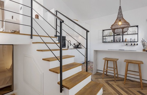 Ambiance Ultra Détendue Partout : Cette maison de ville dispose de plusieurs terrasses qui ont une ambiance super détendue. Que vous vous prélassiez au soleil sur la terrasse supérieure ou que vous vous relaxiez sur les poufs en bas, vous pouvez toujours trouver un coin cosy pour vous détendre et profiter de l'air frais de la mer.