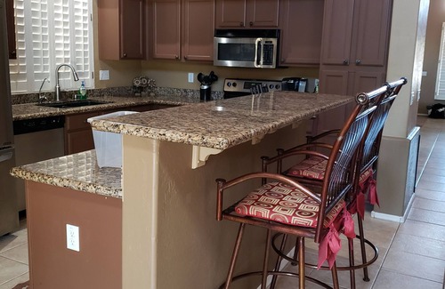 Location de vacances située à la frontière de Gilbert & Chandler. Près des autoroutes principales et à 25 minutes de l'aéroport de Phoenix. Cette maison dispose de 4 chambres et 2. 5 salles de bain et dormira au moins 8. La cour arrière a une piscine, un bain à remous couvert, un foyer extérieur, un barbecue, une terrasse couverte avec un grand coin salon et une table avec des chaises. Il a également une grande surface gazonnée vers l'arrière de la cour. Ainsi que. L'intérieur comprend une laveuse / sécheuse, un bureau, une cuisine entièrement équipée et un immense loft à l'étage avec une télévision, un canapé en L et un curseur qui sort sur le balcon. La chambre principale est en bas et a un curseur qui sort dans la cour. Le maître a également un dressing avec un lit king-size réglable tempurpedic. Il y a 3 autres chambres qui ont toutes des lits queen, 2 sont réglables et 1 est une taie d'oreiller. Il existe également Directv Satellite, Netflix et Internet sans fil.