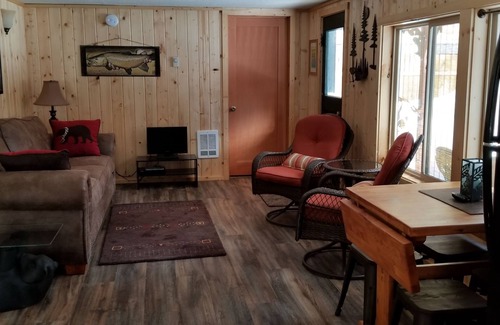 Cozy, comfortable 2 bedroom, 1 bathroom cabin located on Priest Lake with a partial view of the lake. Beds are all queen size. Closet space, shelves and dresser for storage. Kitchen furnished with all the essentials needed. Cabin was completely remodeled last fall, with new furniture and appliances. It is less than 100 feet from the beach with use of semi private dock. Parking behind cabin 2 cars.