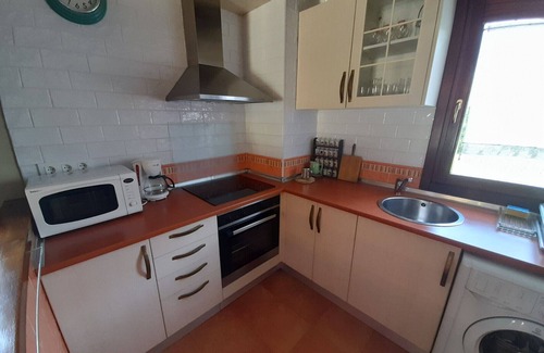 The kitchen is equipped with an oven and a refrigerator, as well as a coffee maker, a microwave, and a toaster. And because there's a washing machine, you can go a bit lighter on your packing.