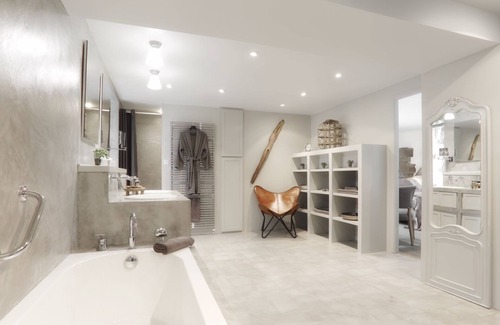 La salle de bain privative est équipée d’une baignoire, d’une douche à l’italienne, de doubles vasques et d’un dressing.