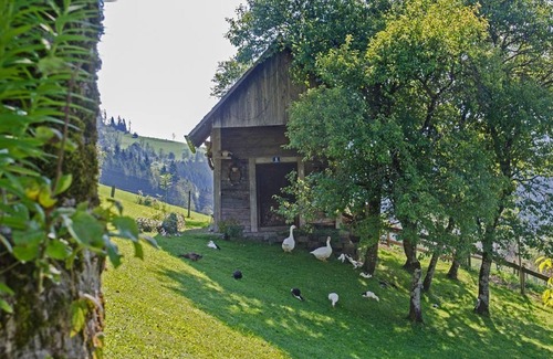 Quietly situated holiday farm with stunning panoramic views, sauna, granary with open fireplace, sun terrace with barbecue, sunbathing lawn, play area, petting animals, tobogganing by torchlight with tractor taxi, torchlight walks, farm's own products and children's juice bar.