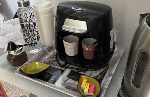 Deux chambres séparées avec une grande salle de bain et douche à l’italienne avec un coin repas et boissons chaudes a disposition