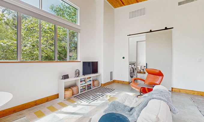 This 1-bedroom vacation home boasts a luxurious bathroom complete with an enormous walk-in shower, bidet, soaking tub, and double vanity stocked with plush towels and basic soaps for your comfort. A private washer and dryer add to the convenience of your stay. With a paved patio and comfortable outdoor furniture perfect for relaxing, plus convenient street parking, this charming cottage is ideal for a romantic getaway or a cozy retreat. Experience the best of Austin from this delightful home, where comfort and convenience come together to create the perfect stay.