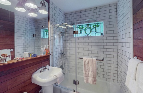 Stepping inside, you're greeted by a style that's both contemporary and classic - think hardwood floors, thoughtful built-ins, a remodeled kitchen and bathroom, and picture windows framing the forest. Highlights of the interior include the elegant kitchen with its new appliances, a vintage-inspired dining room where you can play board games by the soapstone accent stove, and a spacious living room with a limestone fireplace and smart TV (with Xbox One).