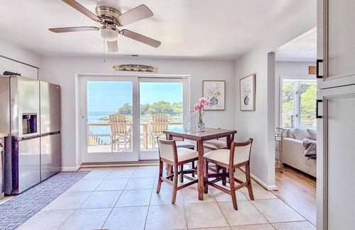 Inside, the home is filled with natural light and comfortable, coastal-inspired decor. There are three bedrooms and two bathrooms, offering space to sleep up to nine guests. The modern kitchen is fully equipped with stainless steel appliances and butcher-block counters, and includes a cozy dining table with seating for four overlooking the water.